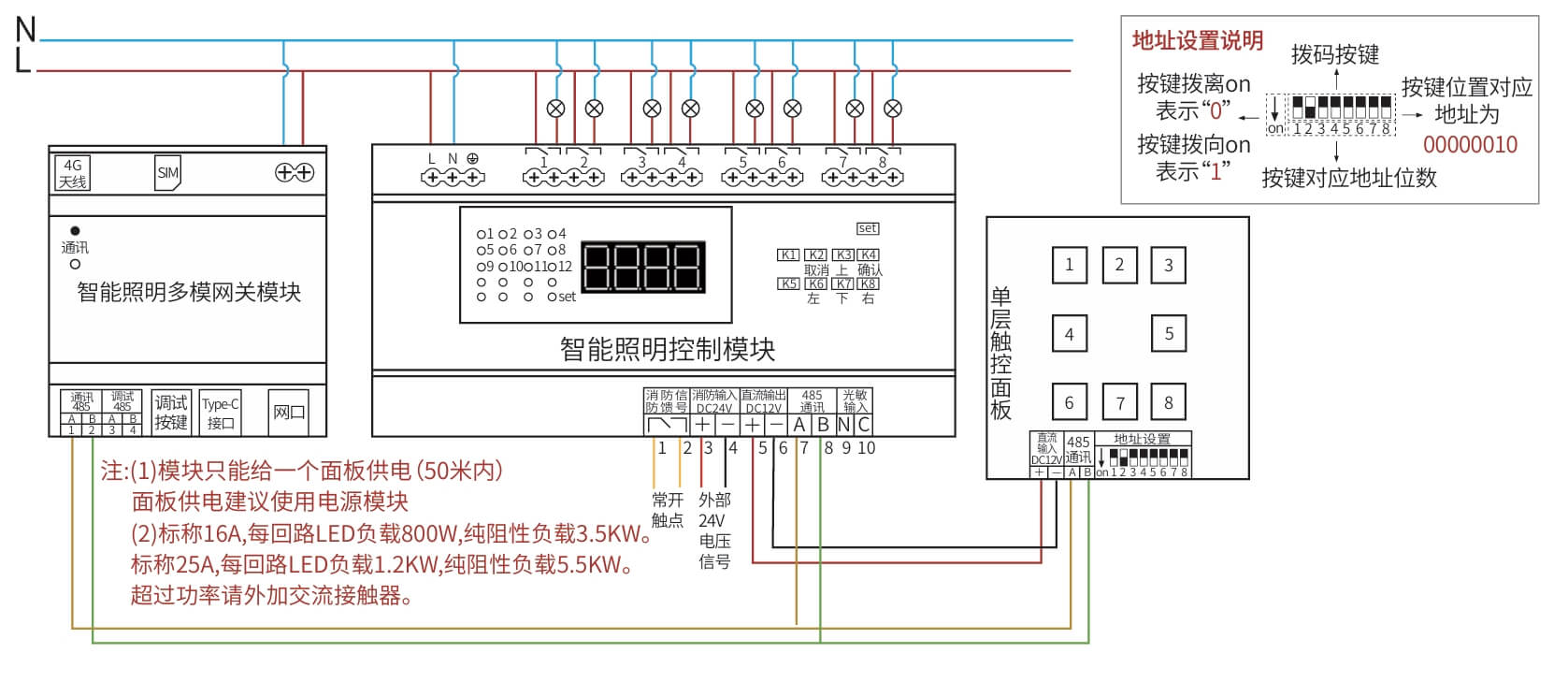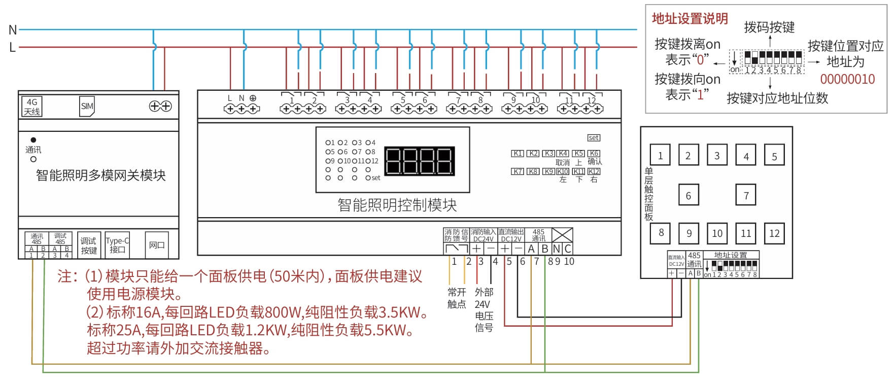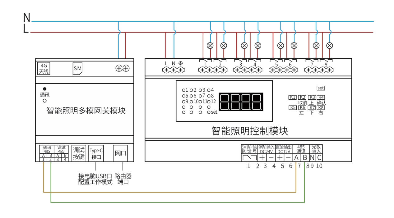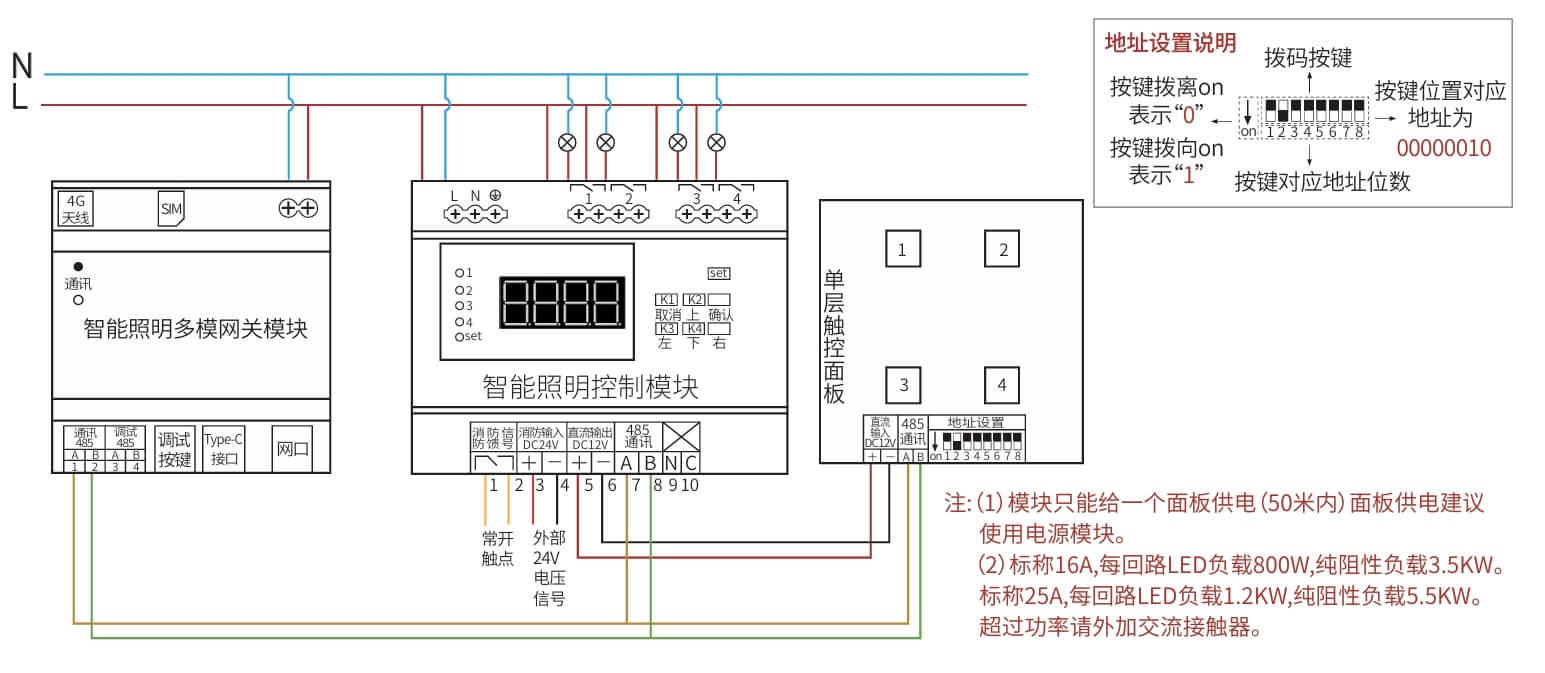 继电器设置全开全关操作、场景管理与开关设置、灯光状态显示、支持批量操作、一键全开全关、RS485通讯,标准Modbus-RTU通讯协议、波特率可调。