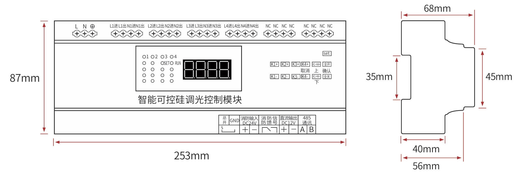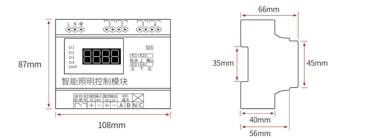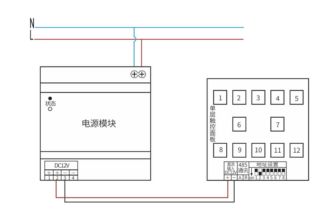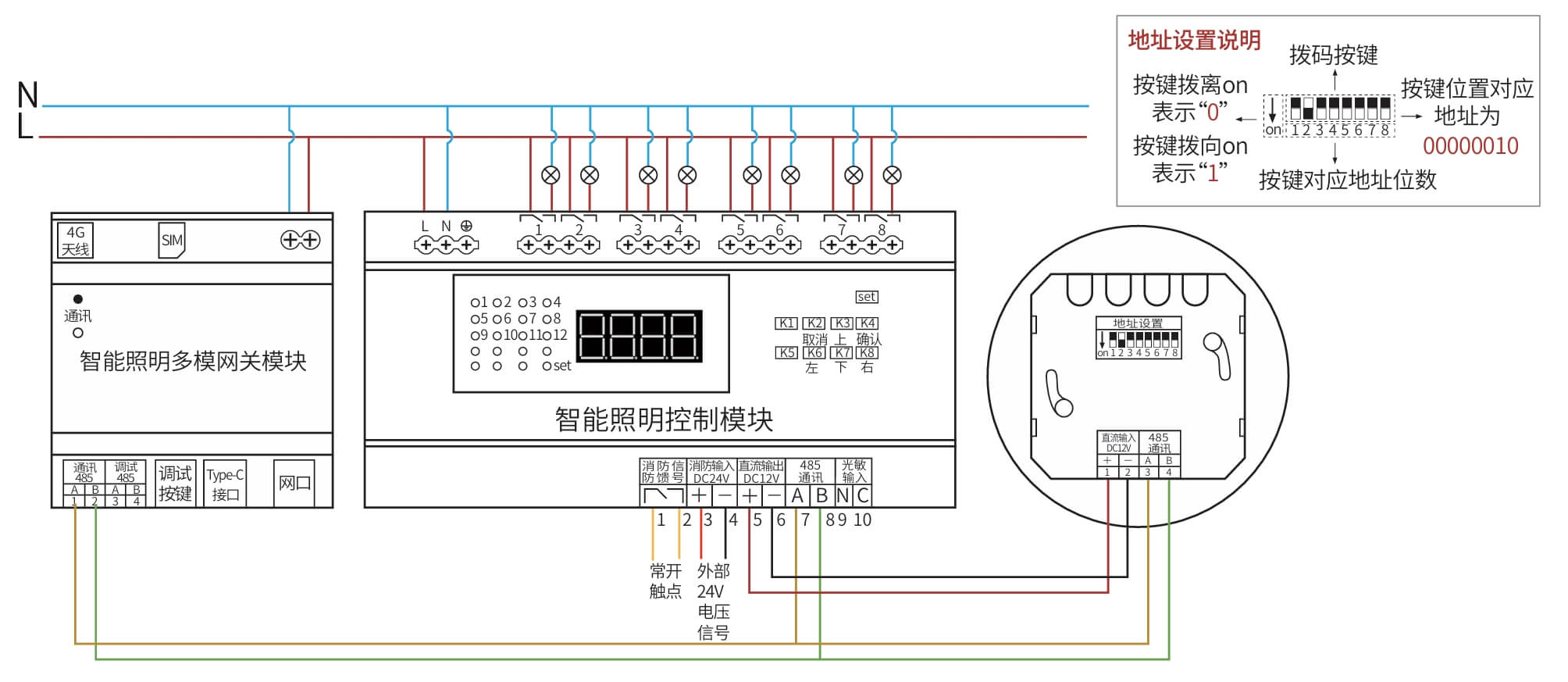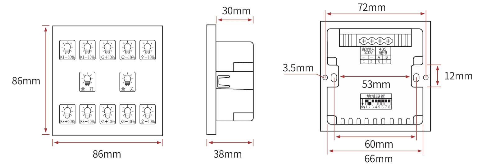 继电器设置全开全关操作、场景管理与开关设置、灯光状态显示、支持批量操作、一键全开全关、RS485通讯,标准Modbus-RTU通讯协议、波特率可调。