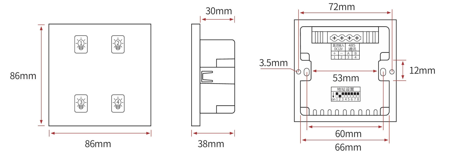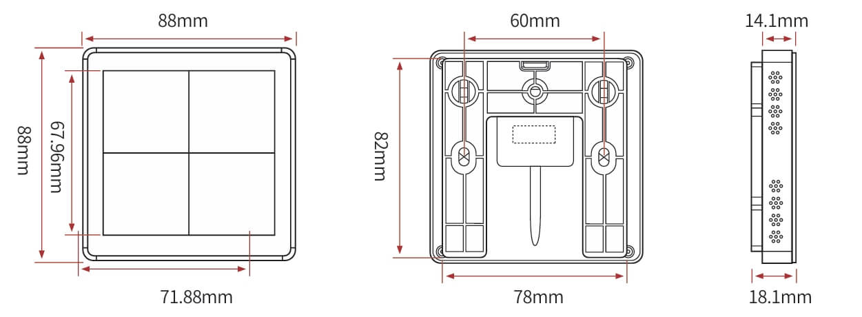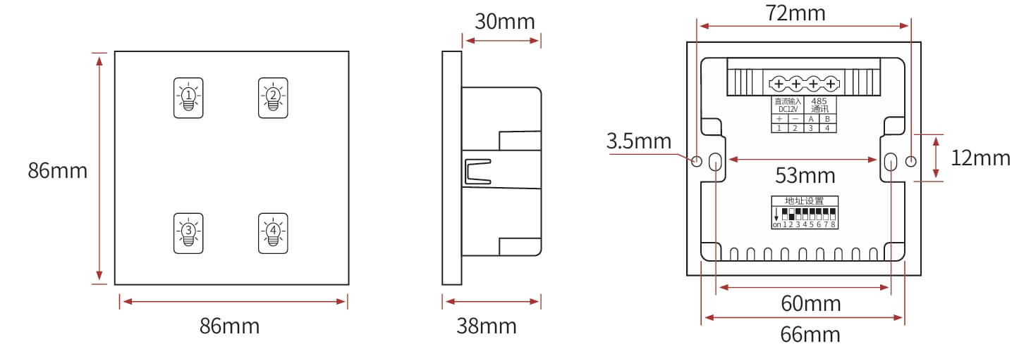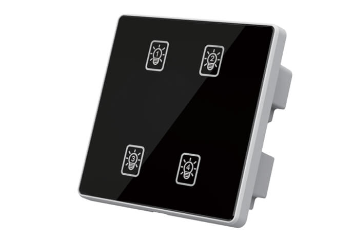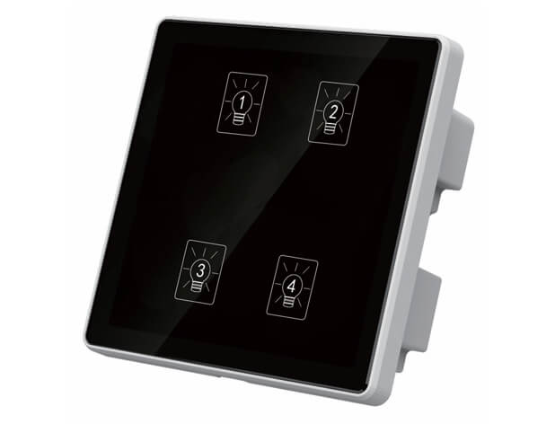 4键模块通道设置、高品质PC双重阻燃、钢化玻璃面板 触摸响应快、可编程面板、面板图案文字效果、自定义场景设定与管理、RS485 通讯、标准Modbus-RTU通讯协议、LED 背光显示。