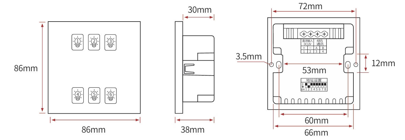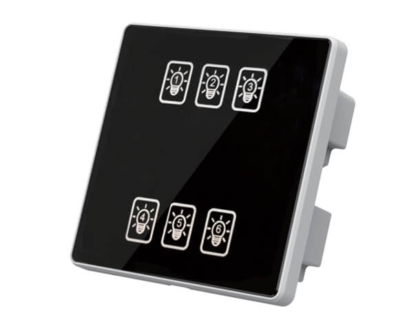 6键模块通道设置、高品质PC双重阻燃、钢化玻璃面板 触摸响应快、可编程面板、面板图案文字效果、自定义场景设定与管理、RS485通讯、标准Modbus-RTU通讯协议、LED背光显示。