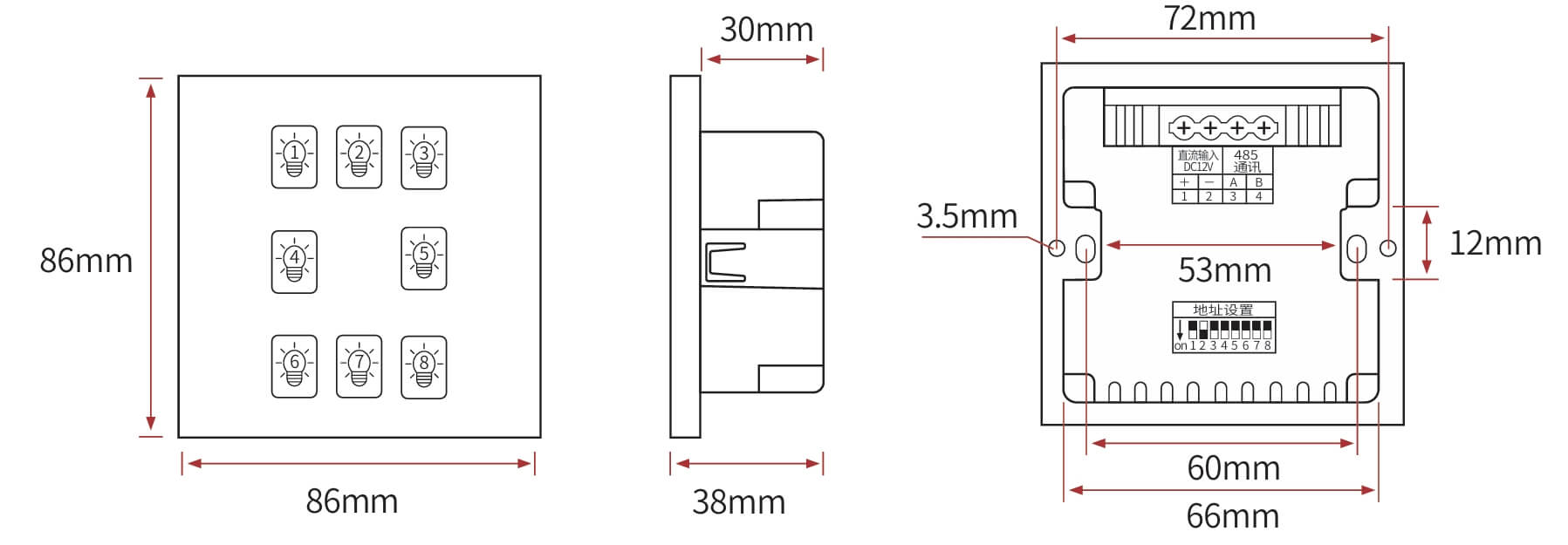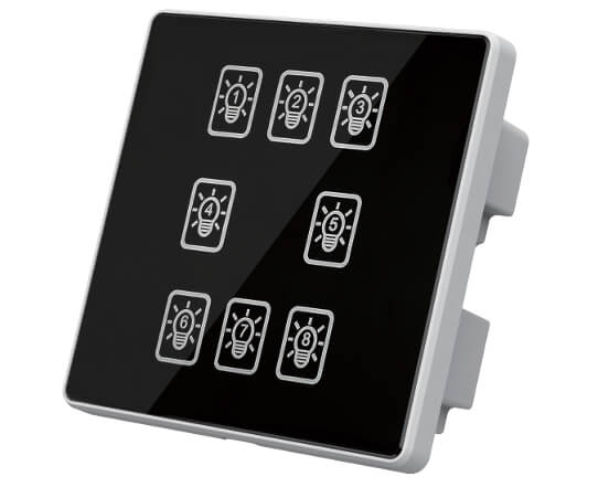 8键模块通道设置、高品质PC双重阻燃、钢化玻璃面板 触摸响应快、可编程面板、面板图案文字效果、自定义场景设定与管理、RS485通讯、标准Modbus-RTU通讯协议、LED背光显示。