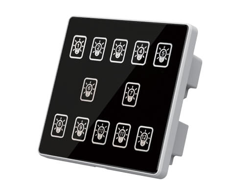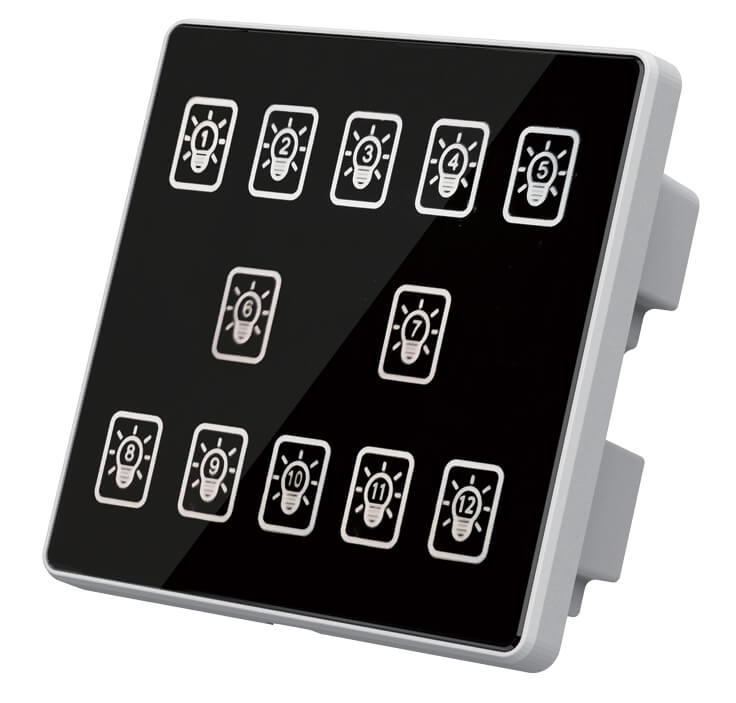 12键模块通道设置、高品质PC双重阻燃、钢化玻璃面板 触摸响应快、可编程面板、面板图案文字效果、自定义场景设定与管理、RS485通讯、标准Modbus-RTU通讯协议、 LED背光显示。