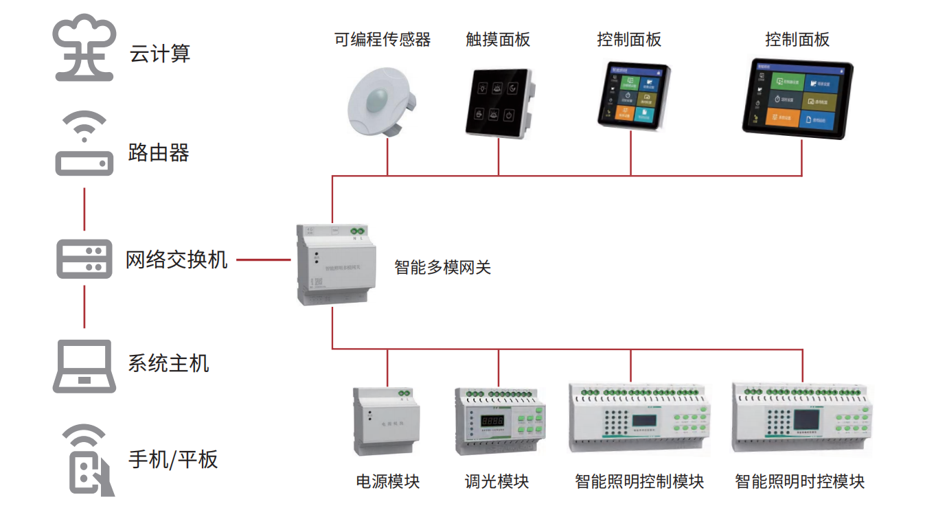 智能照明就是将建筑中的照明进行集中控制,通过直接将照明模块安装在照明配电箱内,对建筑中的照明控制部分实现定时、自动、场景、红外、光控、电脑等人性化的智能控制,使整栋建筑照明控制集中在控制室操作,应用在大厦照明、酒店照明、学校照明、医院照明、场馆照明等等使用。